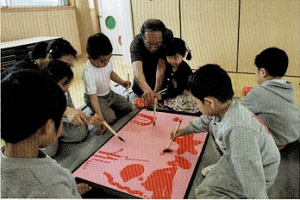 初めは、水黒板を使って筆に慣れていきます。秋からは、墨を使って本格的にひらがなや片仮名を書きます。1月からは感じにも挑戦です。書道は、字が上手になるだけでなく、集中力がつき、頭を使うので思考力や創造力も伸びると言われています。子どもたちが楽しい活動をできる内容です。